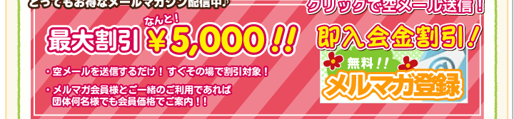 割引情報や新人情報などお得な特典が満載のメールマガジンを不定期に無料にて配信しております。